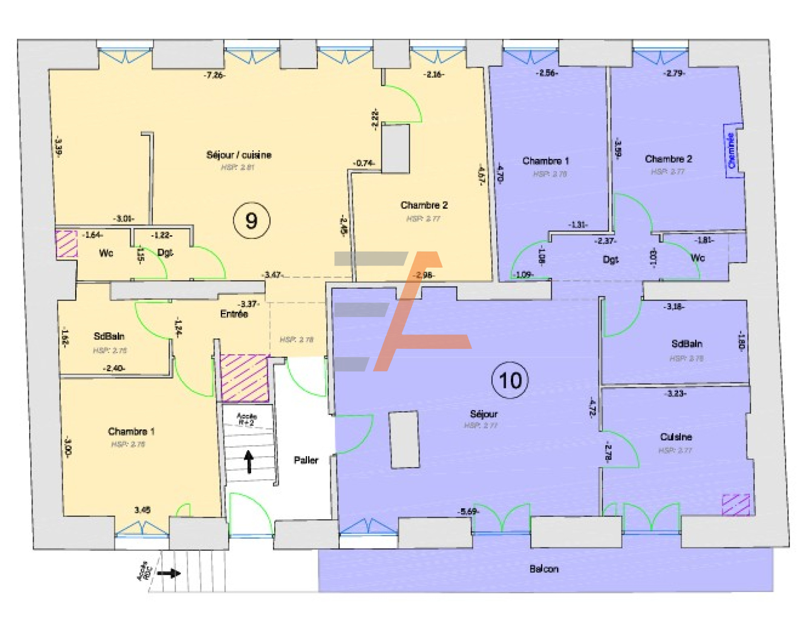- au premier étage, de 2 T3 de 62m² et 69m²