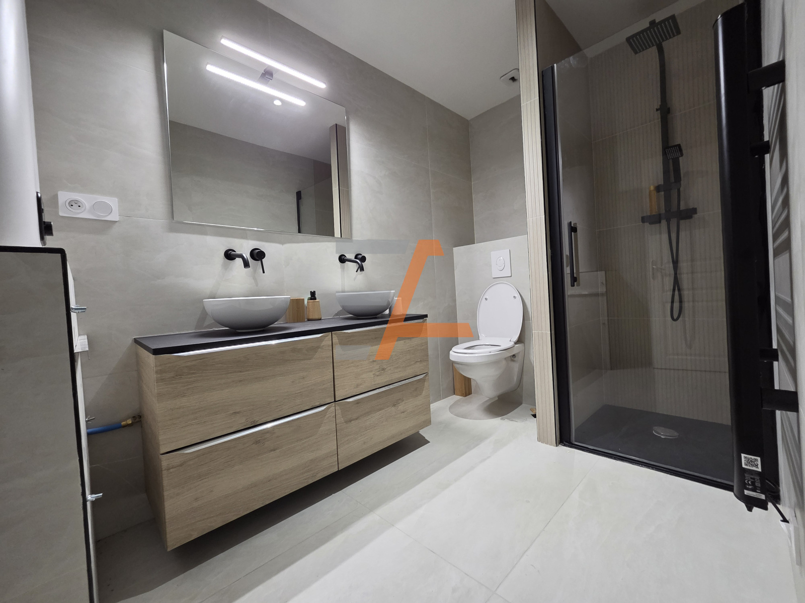 Une salle d’eau rénovée avec WC.